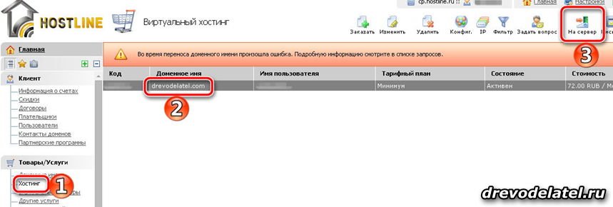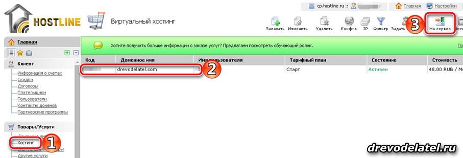 В панели хостинга кликаем на «Хостинг», затем на название тарифа, и жмём на кнопку «На сервер».