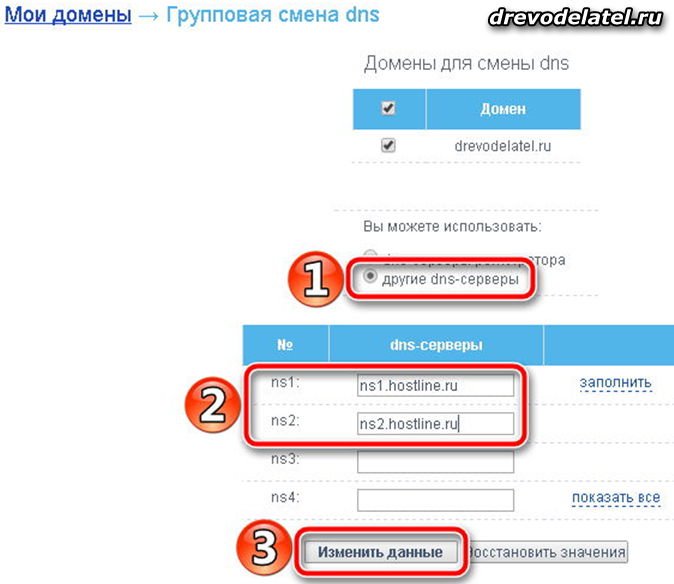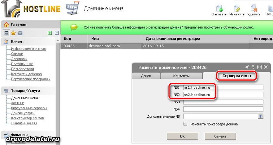Параллельно заглядываем на свой хостинг и копируем серверы имён (DNS).