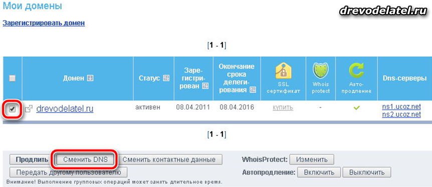 В кабинете регистратора (в моём случае — юкозовском) ставим галочку у своего домена и кликаем на «Сменить DNS».