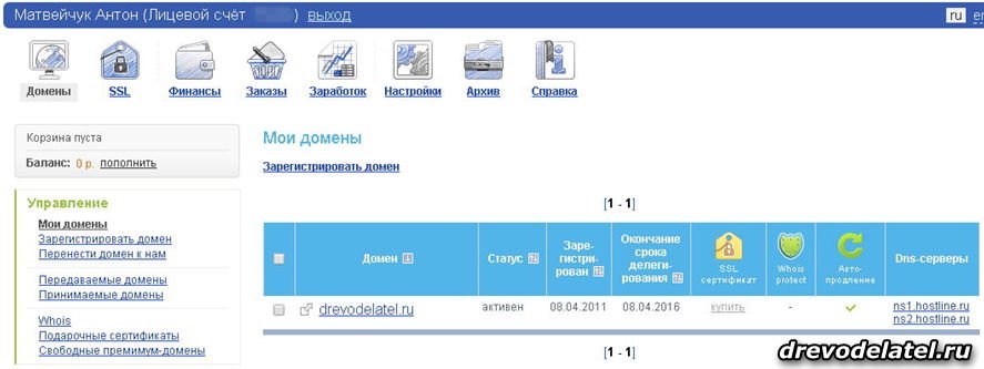Для этого идём туда, где вы покупали и продляете домен. Мне не повезло — как полный «чайник», я приобрёл домен через юКоз, а не у нормальных регистраторов, у которых, в отличие от юКоза, намного ниже цены и на покупку доменов, и на их продление.