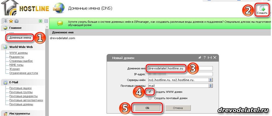 В открывшемся окне кликаем на «Доменные имена», затем на «Создать» и в появившемся окошке создаём временный домен вида ваш_сайт.название_хостинга.su. Вводим доменное имя, серверы имён, ставим галочку у «Создать WWW домен» и жмём «Ok».