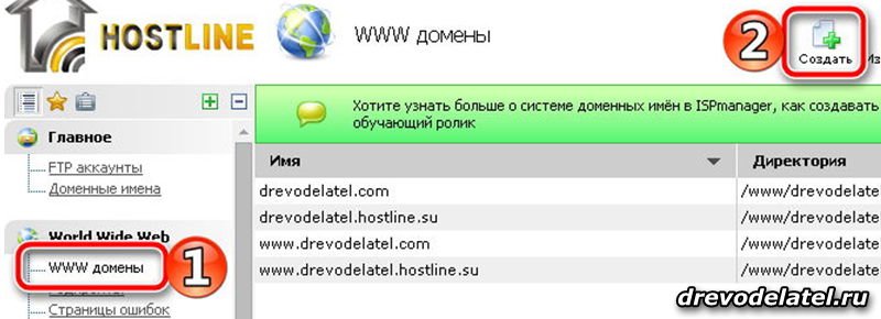 Здесь кликаем на «WWW домены» и жмём на кнопку «Создать».
