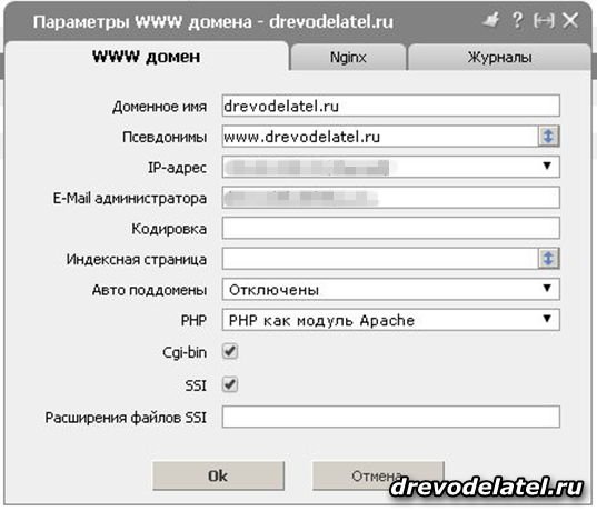 В появившемся окошке вписываем домен, емайл, подключаем PHP, ставим галочки и жмём на «Ok».