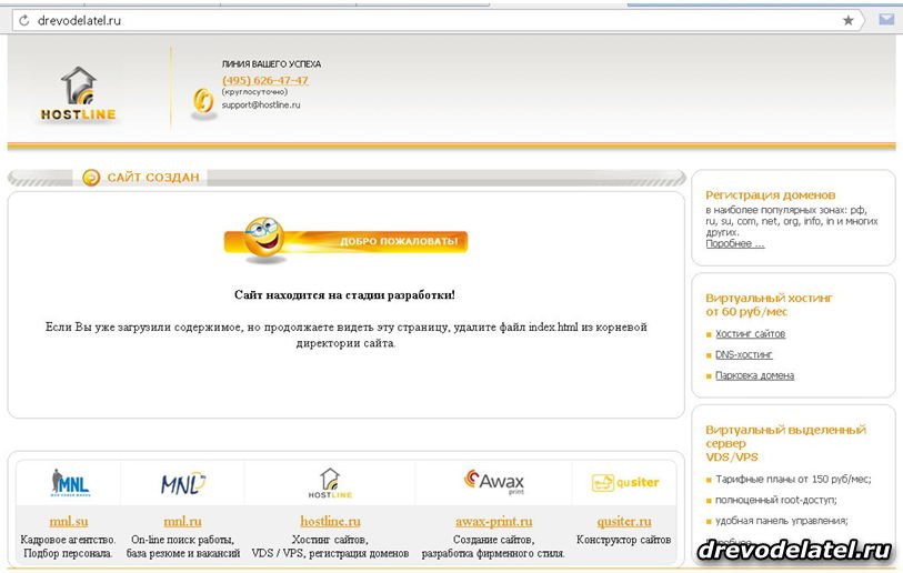 Теперь, если ввести в браузере свой домен, откроется стандартное окно хостинга. Домен перенесён! Теперь нужно перенести всё содержимое с сайта-черновика на новый окончательный сайт с нашим доменом.
