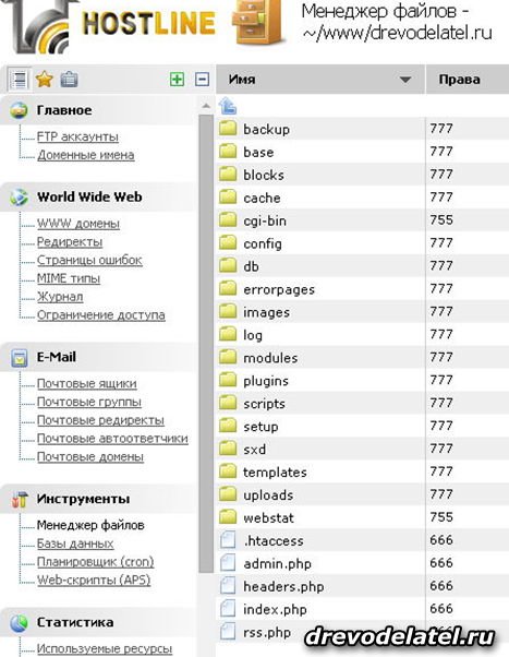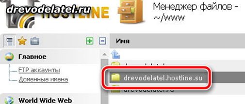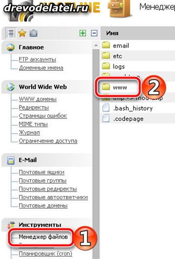 Сначала перенесём все файлы с сайта-черновика на новый сайт. Для этого в панели хостинга кликаем на «Менеджер файлов», затем на «www».