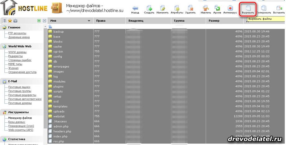 Выделяем все файлы сайта и кликаем на кнопку «Вырезать».