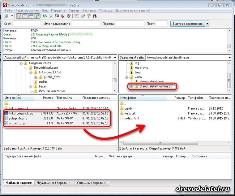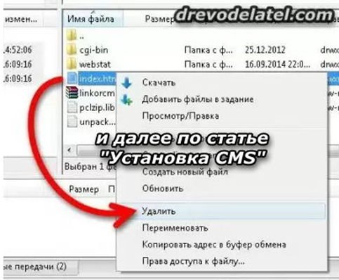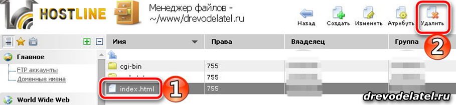 Здесь сначала удаляем стартовую страницу хостинга «index.html».