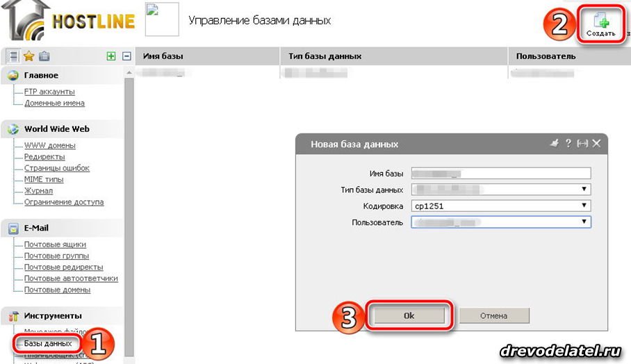 Затем идём в «Базы данных», кликаем на «Создать», и создаём базу данных для сайта-черновика. Пользователя выбираем из уже существующих, то есть, себя.
