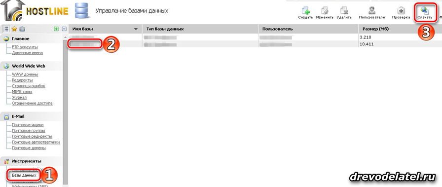Сначала скачиваем базу данных с сайта-черновика, она нам понадобится для обновления базы нового сайта. Для этого кликаем на «Базы данных», выделяем базу сайта-черновика и скачиваем, нажав на кнопку «Скачать».