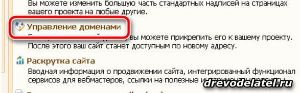 Итак, сначала нужно открепить свой домен от юкозовского сайта. Прежде всего пишем на сайте новость, предупреждая посетителей сайта о возможных неудобствах во время переноса. Потом идём в панель управления своего сайта на юКозе и кликаем на «Управление доменами».