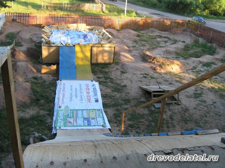 На фото разгонка и вылеты выглядят нормально, но вживую, поднявшись на верх, мне стало реально не по себе. Довольно крутой угол спуска разгонки и резковатый вылет в поролонку также не добавили мне спокойствия, так что максимум, что я смог, так это с притормаживанием попрыгать с синего, менее экстремального, вылета.