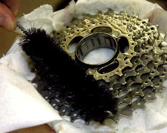 Сними кассету и обильно полей её смывкой для смазки. Потом возьми щётку и хорошенько пройдись по ней. Обрати внимание на лапки паука (на которых закреплены звёздочки). Именно там чаще всего прячется грязь. Внимательно осмотри корпус трещотки. Если он заржавел, почисти его и спрысни маслом из баллончика. Поставь кассету на место.