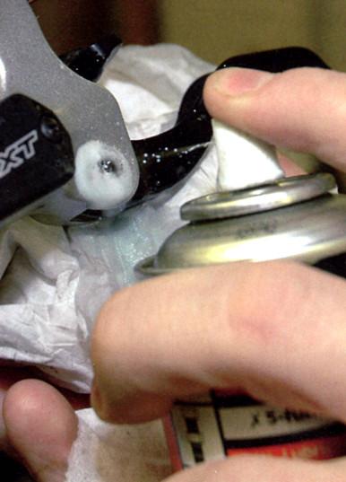 На оси вращения тормозных ручек надо нанести немного масла из баллончика, лучше с трубочкой, чтобы не поливать всё вокруг. Лишнее вытереть. В манетках типа RapidFire (Shimano или SRAM) нужно снять заглушку, закрывающую место, через которое вставляется тросик (маленькая пробочка со шлицом под крестообразную отвёртку), и туда тоже брызнуть немного смазки.
