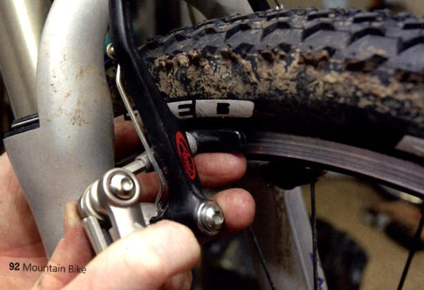 Пользователям дисковых тормозов надо извлечь колодки (при этом постараться не потерять стопорные шплинты и т.д.). Если толщина материала накладки меньше 1 мм или износ неровный, колодки надо заменить. Не забудь заглянуть в суппорт, вдруг там что-нибудь застряло.