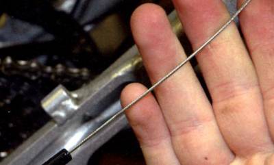 Переключи задний переключатель на самую большую звезду (обычно 32 зуба), а потом, не вращая педали, скинь на самую маленькую. Цепь не даст переключателю сильно сдвинуться, но при этом ослабнет тросик, и ты сможешь без особого труда отстегнуть рубашки от рамы. Двигая их по тросику туда-сюда и добавляя на тросик смывку, их можно прочистить, а потом и смазать жидким маслом. При этом не надо ничего разбирать, а значит, потом настраивать. Если тросик капитально заржавел или рубашка протёрлась/ заломилась, их придётся заменить.