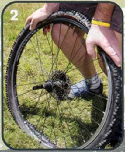 Растяните: Поверните колесо ниппелем вверх. Слегка сожмите верх покрышки и начинайте вытаскивать обе стороны наружу.