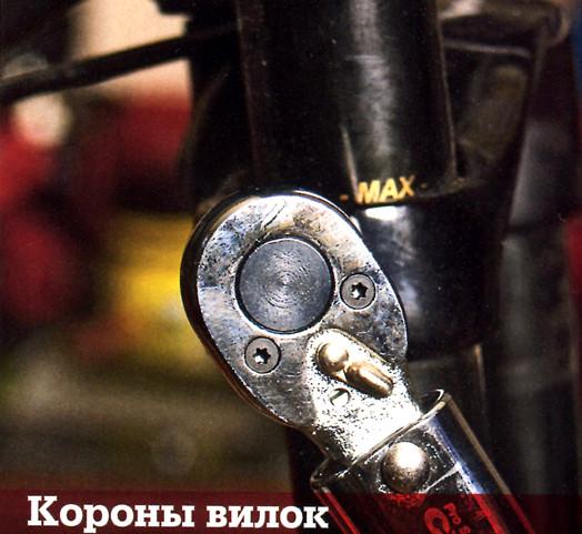 Чтобы избежать этой напасти, периодически проверяй затяжку болтов, пользуясь ключом с регулятором усилия (динамометрическим ключом, если он, конечно, у тебя есть). Двухкоронные вилки — удовольствие не из дешёвых, так что вряд ли ты захочешь угробить их при помощи кондового шестигранника.