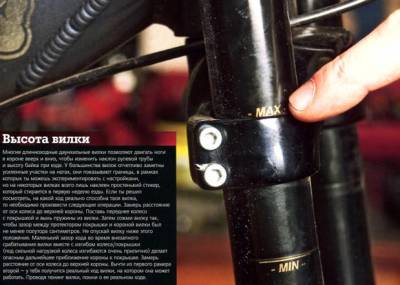 Многие длинноходные даунхильные вилки позволяют двигать ноги в короне вверх и вниз, чтобы изменить наклон рулевой трубы и высоту байка при езде. У большинства вилок отчётливо заметны усиленные участки на ногах, они показывают границы, в рамках которых ты можешь экспериментировать с настройками, но на некоторых вилках всего лишь наклеен простенький стикер, который стирается в первую неделю езды. Если ты решил посмотреть, на какой ход реально способна твоя вилка, то необходимо произвести следующие операции. Замерь расстояние от оси колеса до верхней короны. Поставь переднее колесо с покрышкой и вынь пружины из вилки. Затем сожми вилку так, чтобы зазор между протектором покрышки и короной вилки был не менее полутора сантиметров. Не опускай вилку ниже этого положения. Маленький зазор хода во время внезапного срабатывания вилки вместе с изгибом колеса/покрышки (под сильной нагрузкой колёса изгибаются очень прилично) делает опасным дальнейшее приближение короны к покрышке. Замерь расстояние от оси колеса до верхней короны. Вычти из первого рамера второй — у тебя получится реальный ход вилки, на котором она может работать. Проводя тюнинг вилки, помни о её реальном ходе.