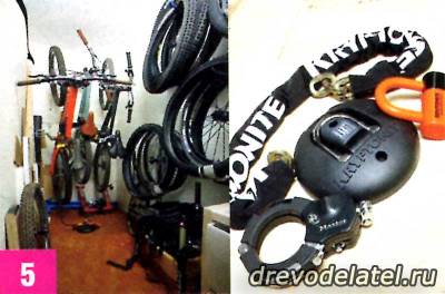 Колёса, покрышки и сами байки занимают много ценного места, так что их лучше повесить. Крюки разной ширины для байка, колёс и резины можно купить в магазине ИКЕА или ему подобных гипермаркетах, ну или, на худой конец, на ближайшем строительном рынке.