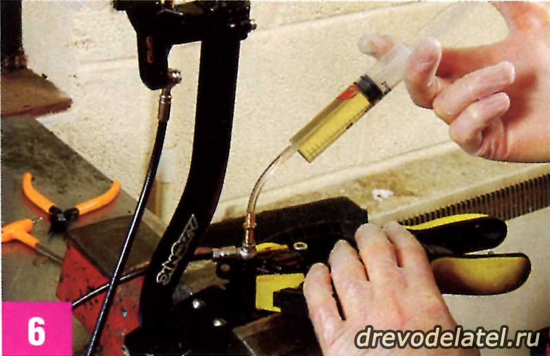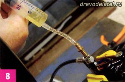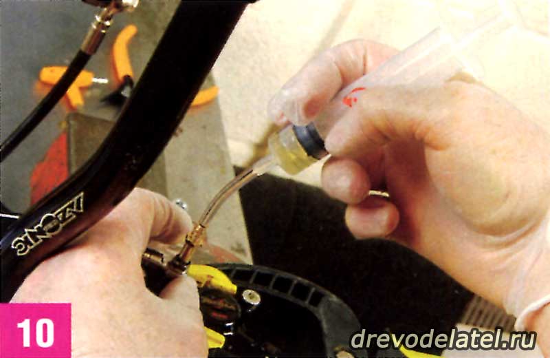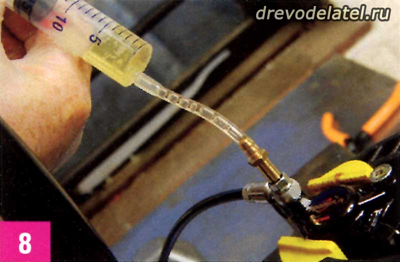 Когда решишь, что таким способом из системы вышло достаточно воздуха, перестань тянуть за поршень, отпусти тормозной рычаг (сними стяжку/липкую ленту) и прокачай жидкость из шприца на калипере в шприц на ручке. Потом обратно, и так три-четыре раза, пока не убедишься в том, что весь воздух вышел. Ни в коем случае не нажимай на шприцы до конца.