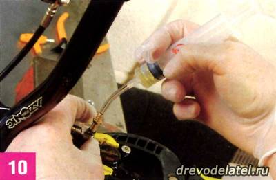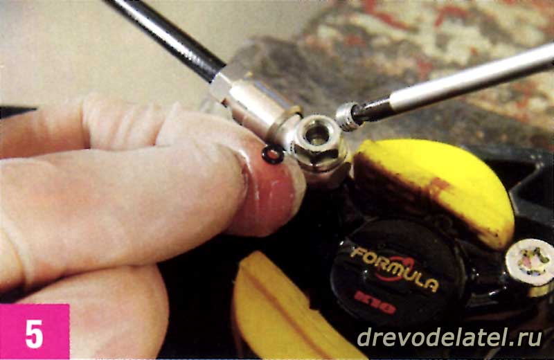 Набери в первый шприц 20 миллилитров чистой тормозной жидкости DOT4 или 5.1 (или 10 мл, если используешь комплект для прокачки Avid) и присоедини его к калиперу, предварительно сняв крепёжный болт и малюсенькую крутую прокладку с помощью отвёртки под звезду Т-10. Налей немного тормозной жидкости во второй шприц и присоедини его к порту для прокачки на ручке. Если прокачиваешь Avid Juicy Seven, то до конца отпусти регулировку расстояния между колодками.