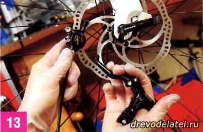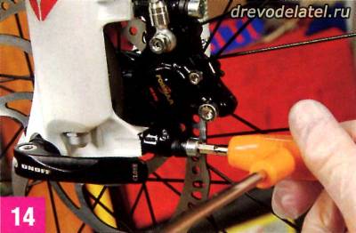 Поставь на место тормозные колодки и проверь работу системы, вставив в калипер тормозной диск и нажав рычаг. Если рычаг слишком близко подходит к рулю, значит, систему надо прокачивать ещё раз, поэтому повтори пункты 3—12. Если поршни не возвращаются на место, то, возможно, тормоз нужно отдать в ремонт. Если всё в порядке, то переходим к следующему шагу.