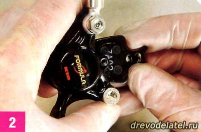 Вынь из калипера тормозные колодки, чтобы не запачкать их тормозной жидкостью. В случае с тормозами Formula вытащи крепёжный болт и разделительный пин, и вынь колодки из калипера. В случае с Avid вынь крепёжный зажим, а затем по очереди вытащи колодки за специальное ушко, потянув вниз и в сторону от поршня.