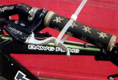 3. С помощью пластикового хомута или резинки притяни тормозную ручку к рулю, чтобы колодки прижались к диску. Поршни в калипере должны иметь одинаковый ход, чтобы колодки прижимались к диску одинаково и плотно.