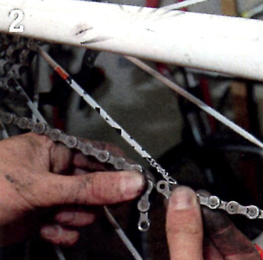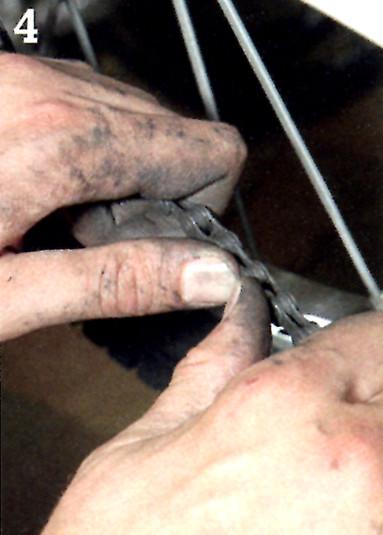4. Прокрути трансмиссию, если какие-нибудь звенья щёлкают, возможно, они заедают. Их надо ослабить, для этого возьми цепь в руки и, уперевшись большими пальцами в заедающее соединение, немного согни её поперёк. Если в твоей выжимке две пары зубцов — воспользуйся второй парой, чтобы немного раздвинуть звено.