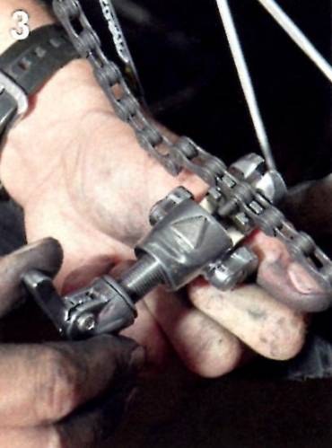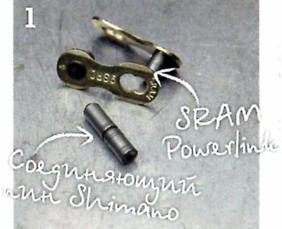 1. Для начала, цепь нужно разъединить. Если цепь Shimano, то тебе понадобится специальный инструмент — выжимка. Установи в неё любое звено цепи и, вращая ручку, выдави соединительную ось — пин. В цепях фирмы Sram всё гораздо удобнее, и специальный инструмент не нужен, поскольку одно из звеньев в виде замка — Powerlink. Просто сожми его вдоль оси цепи, и он расстегнётся. Золотистый замок — для девятирной цепи, серебристый — для восьмирной.
