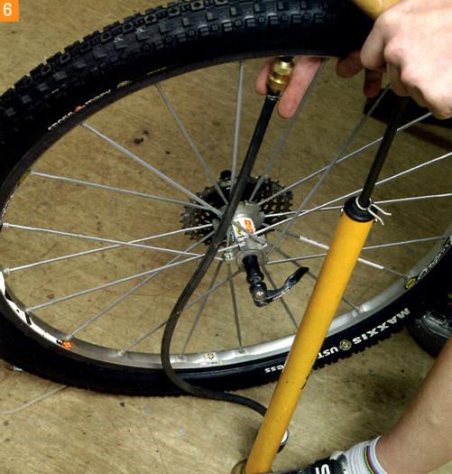 6. Теперь накачай колесо как обычно. Тебе, скорее всего, понадобится нечто большее, чем обычный насос — лучше использовать автомобильный компрессор с переходником или большой ручной насос, который ставится на пол. Немного герметика может просочиться между покрышкой и ободом, но как только покрышка сядет на место, всё встанет на свои места. Вытри выступивший герметик тряпкой и прокрути колесо, чтобы герметик равномерно распределился по внутренней поверхности покрышки.