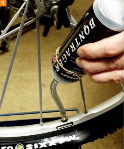 4. Процедура заливки герметика будет различна в зависимости от бренда, так что ознакомься с инструкцией на баллончике. Как правило, это происходит так — прозрачная трубочка подсоединяет баллончик к колесу, повёрнутому ниппелем вниз, и от 30 до 60 мл герметика, в зависимости от размера покрышки, выдавливаются в колесо. Обычно нужный объём можно найти в инструкции.