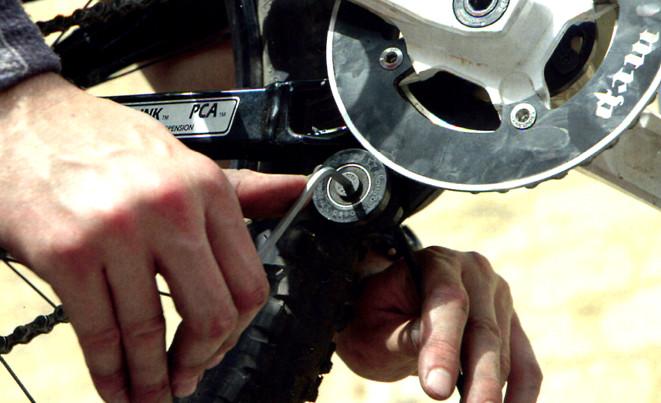 2. Прикручиваешь «банан» напрямую к «ушкам» на кареточном стакане. В нём сделаны прорези так, чтобы он мог поворачиваться на 30° и обеспечить подходящее положение верхнего прижимного ролика на любой раме. Прежде чем затянуть болты, убедись, что ролик занимает правильное положение. При полностью сложенной подвеске цепь должна слегка касаться дна канавки в нём. При ходе подвески в 6 дюймов ролик должен стоять строго на 12 часов, при меньшем — на 11:30. Положение верхнего ролика очень важно! Ты можешь надеть шатун со звездой, не затягивая его, установить ролик в правильное положение, снять шатун, затянуть болты «банана» и потом собрать всё остальное. Не забудь капнуть на крепежные болты «банана» фиксатором резьбы. В System 2 затяни 2-миллиметровым шестигранником болтики в нижней части «банана».