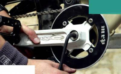 3. Установи шатуны на место и прикрути их с усилием, рекомендованным производителем. Надень цепь на звезду и настрой ролики так, чтобы канавки в них были по центру цепи. Для этого ролики можно переворачивать и/или использовать проставочные шайбы. Оба ролика должны касаться шайб, чтобы вращаться вместе с системой. Крепление роликов нужно затягивать одновременно с внутренней и наружной сторон.