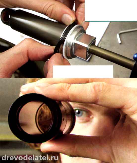 7. Осмотри внутреннюю сторону корпуса воздушной камеры и корпус амортизатора на предмет царапин и выбоин от камней. Если ты что-нибудь чувствуешь ногтём, деталь подлежит замене. Все же не забудь, что у наружного уплотнения есть порт для прохождения воздуха. Проверь сальники: когда снимаешь воздушную камеру, на корпусе амортизатора должно оставаться кольцо грязной смазки слева от уплотнения, но справа смазка должна оставаться чистой. Это показывает, что сальник всё ещё работает. Просто почисти их контактным очистителем, доступным в автомобильных магазинах, и дай высохнуть. Не используй для этого велосипедные очистители, так как они могут повредить сальники и алюминиевые детали. Если сальники начали изнашиваться, замени их новыми и обслуживай аморт чаще.