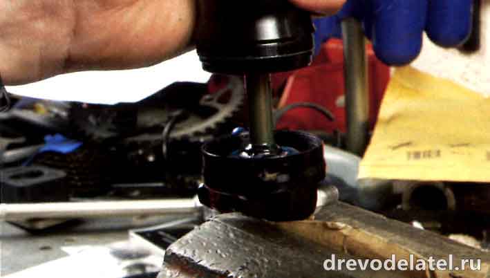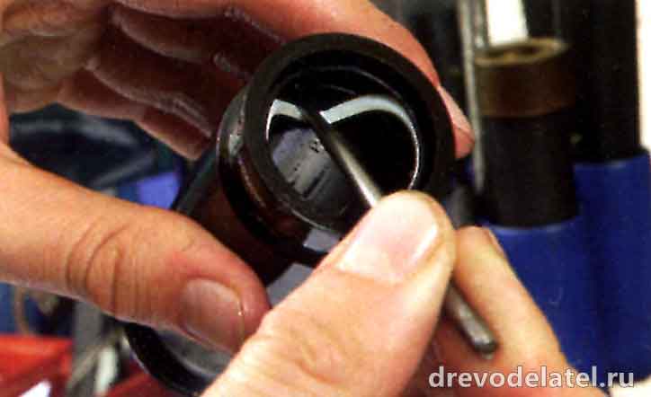 6. Удали всю смазку и грязь с внутренней стороны корпуса воздушной камеры и с корпуса амортизатора. Осторожно сними сальники путём сжимания и вытягивания уплотнительного приспособления из корпуса. Удали О-образную прокладку маленького отверстия у конца резьбы стержня. Вычисти всю грязь и затем толкай сальник вниз и наружу через воздушную камеру. Ты можешь сжать сальник с обеих сторон и толкнуть вперёд. Кольцо поднимется наверх, и ты сможешь его легко подцепить. Не используй металлические инструменты, потому что корпус легко царапается.