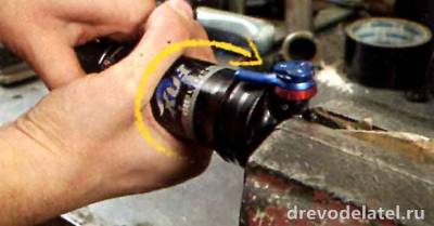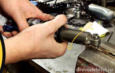 3. Сними монтажные детали (алюминиевые проставки, а не втулки) путём зажимания их в тиски и поворачивай аморт туда-сюда, пока они не вылезут. Если втулка с тонкого конца уже 22 мм, её можно не снимать.