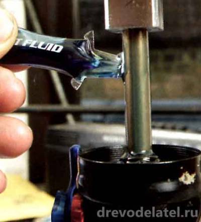 8. Замени сальники в камере и на главном воздушном поршне, затем покрой новые небольшим количеством густой смазки. Зажми аморт вертикально в тисках и налей немного самого жидкого вилочного масла на корпус амортизатора. Теперь осторожно толкай воздушную камеру вниз по корпусу аморта, пока воздух не перестанет проходить между корпусом и прокладкой.