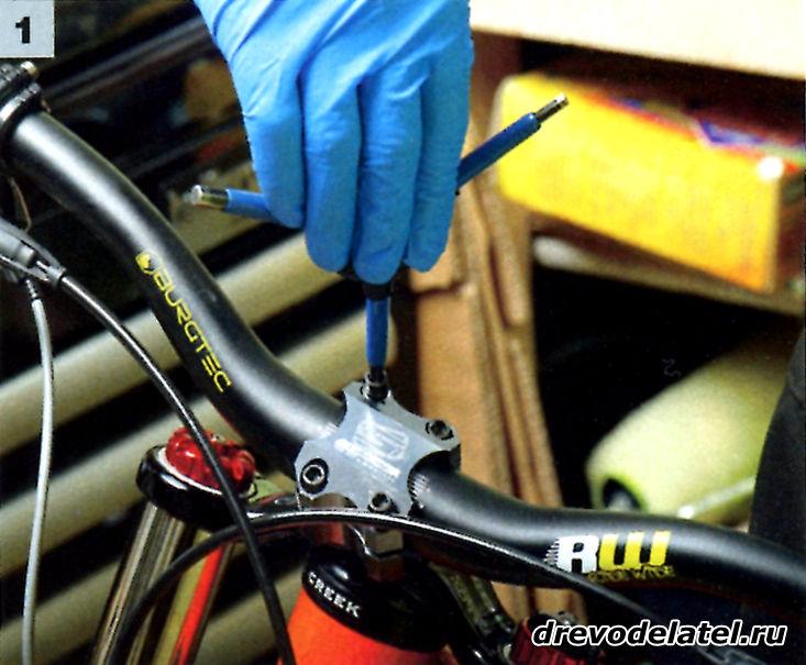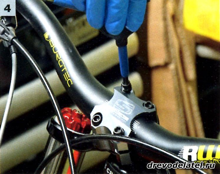 1. Во-первых, сними руль с выноса, поочередно откручивая каждый противоположный болт по диагонали, а потом соседний болт на пол-оборота до тех пор, пока их можно будет открутить рукой. Таким образом, ты убережёшь свои болты от чрезмерной нагрузки. В случае с двухболтовыми выносами поочередно откручивай верхний и нижний болты на пол-оборота.