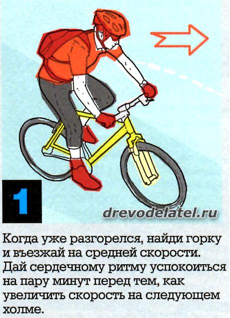 1. Когда уже разогрелся, найди горку и въезжай на средней скорости. Дай сердечному ритму успокоиться на пару минут перед тем, как увеличить скорость на следующем холме.