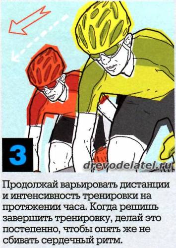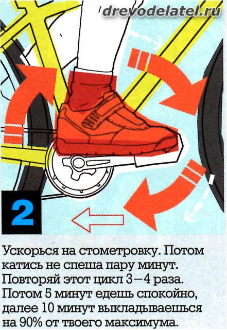 2. Ускорься на стометровку. Потом катись не спеша пару минут. Повторяй этот цикл 3-4 раза. Потом 5 минут едешь спокойно, далее 10 минут выкладываешься на 90% от твоего максимума.