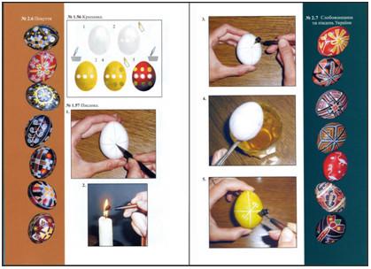 Красочная книга на украинском языке пасхальные яйца в стиле писанки. Есть как красивые фотографии готовых яиц, так и поэтапные фотографии процесса их росписи.