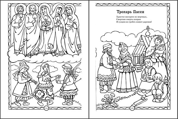 Пасхальная книга-раскраска с кратким описанием праздника, стихами и тропарем. В архиве 2 файла в форматах PDF и DJVU, 20 страниц.