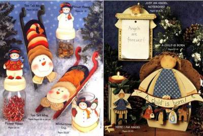 Красочные журналы «Holiday Heartwarmers» с проектами и фотографиями рождественских сувениров и поделок с росписью.