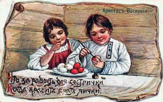 Вернувшись из церкви ранним утром в Светлое Христово воскресение, люди обменивались яйцами и христосовались со своими домашними, (причём христосовались все без различия сословий — хозяева со слугами и т.д.) и по традиции садились за празднично накрытый стол, уставленный куличами, пасхами и другими всевозможными кушаньями. Кончился Великий пост и можно было первый раз есть скоромную (не постную) пищу (разговляться). Читать дальше»
